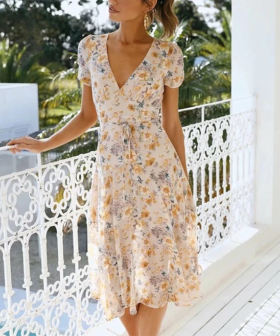 Head to your next casual event in style with this chic dress that features a flattering v-neckline, ruched short sleeves and a pretty floral print.