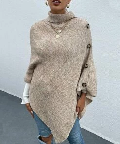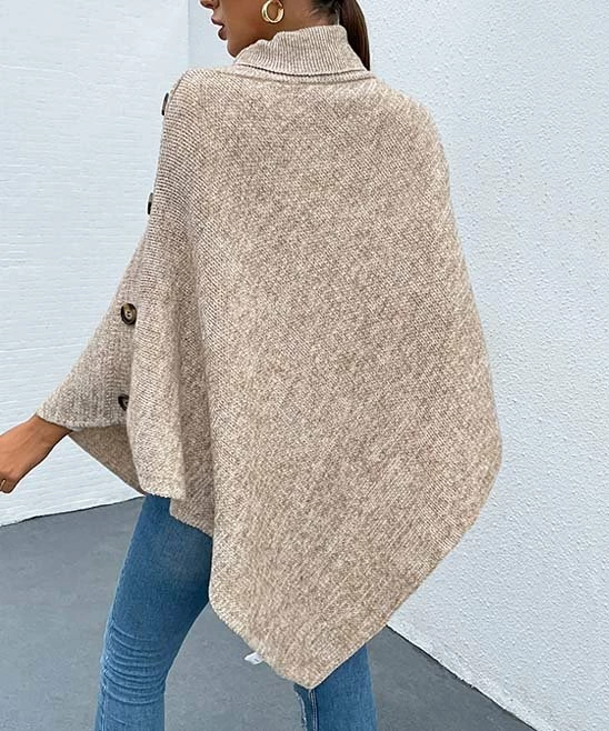 Top off your ensembles with this turtleneck poncho featuring button embellishments and supersoft fabric for comfortable style that pairs effortlessly with jeans or leggings.
