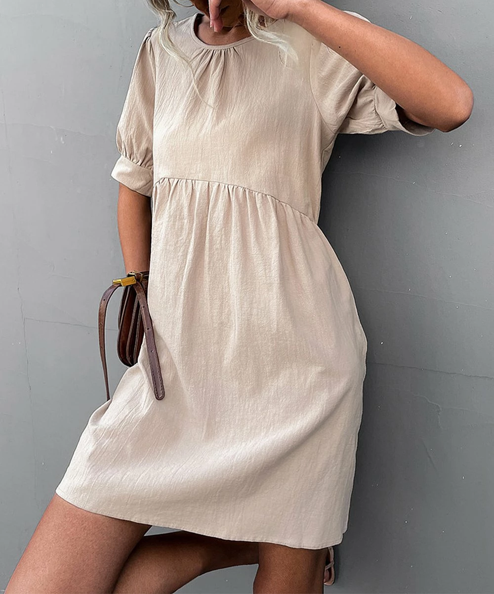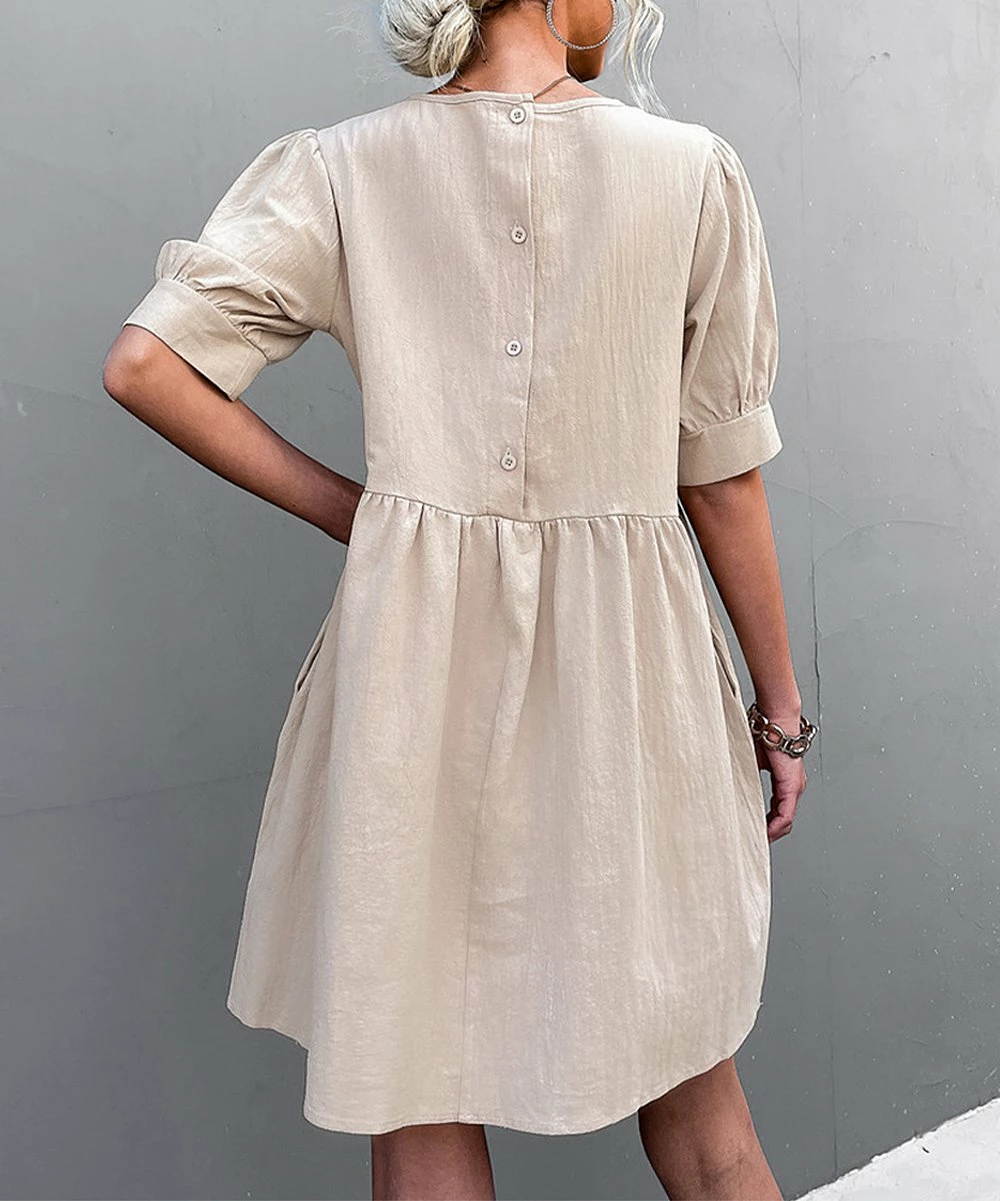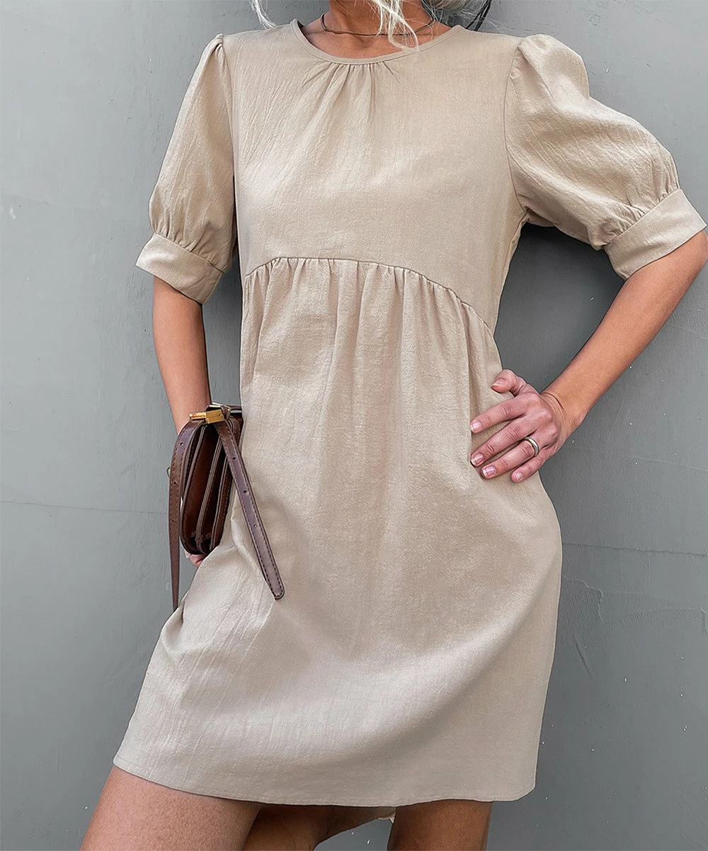 Look cute while feeling comfy in the playful design of this empire-waist dress featuring a shift silhouette with cuffed short sleeves and a button-up back.