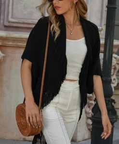 Update your closet with the basics you need with this black cardigan that features a fringe design, a must-have classic.