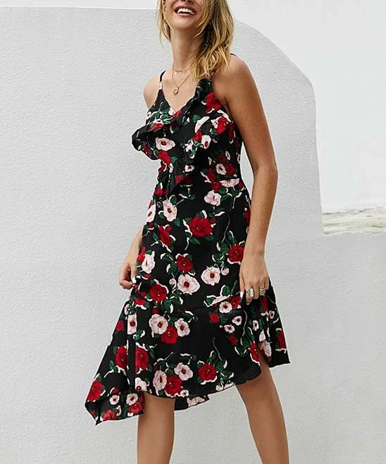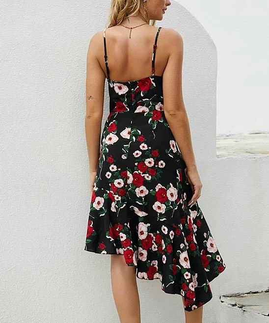 Great for garden parties, dinner dates or warm-weather weddings, this gorgeous sleeveless dress features fresh florals, feminine ruffles and a unique asymmetrical hemline.