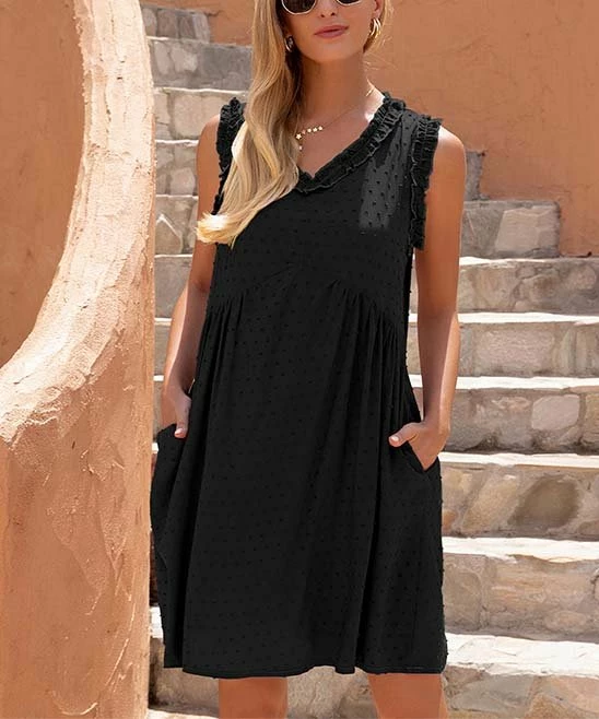 Breeze through your day in this sleeveless A-line dress featuring handy pockets and a solid hue.