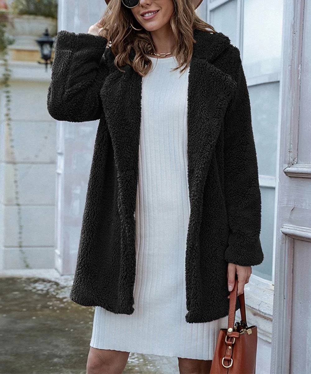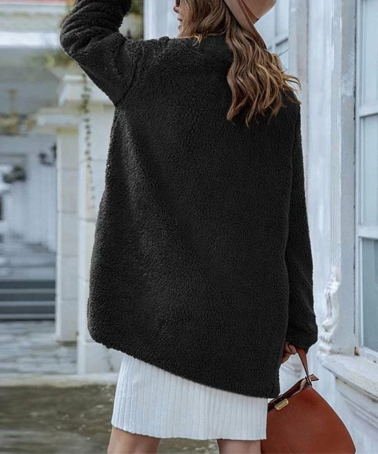 Cozy up on cooler days with this teddy jacket with notched lapels and a button closure.