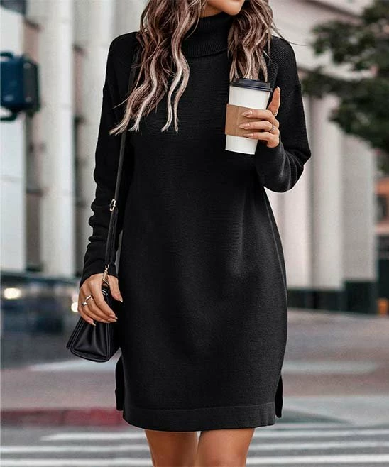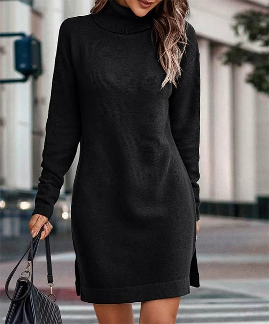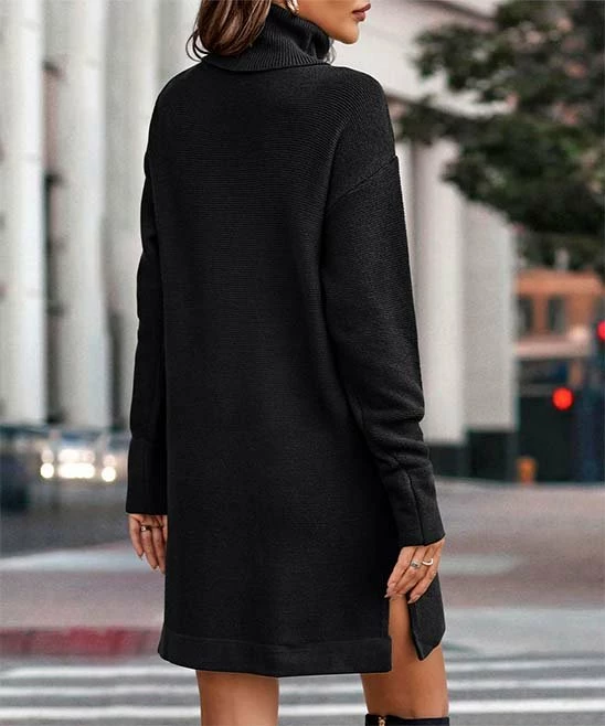 This sweater dress features side slits, a relaxed fit and warm turtle neckline.