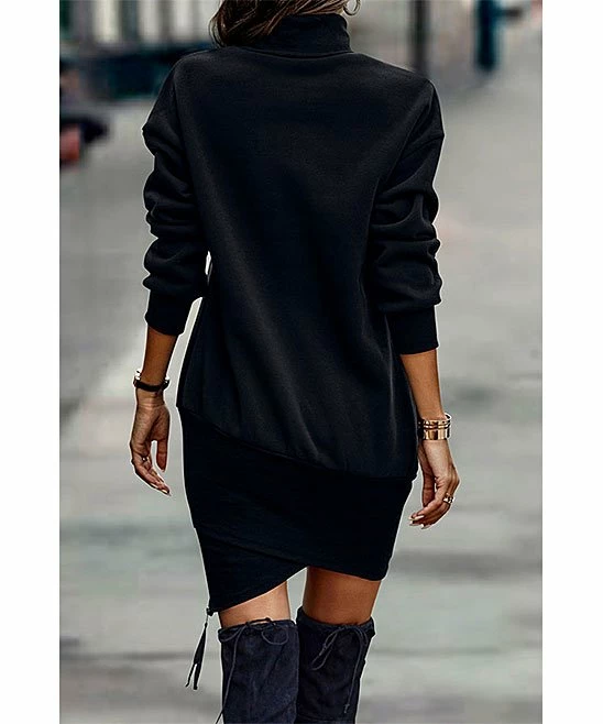 Stay cozy on off-duty days wearing this sweater dress designed with a zip-accented tulip hem and roomy bishop sleeves. Solid hue for easy pairing.