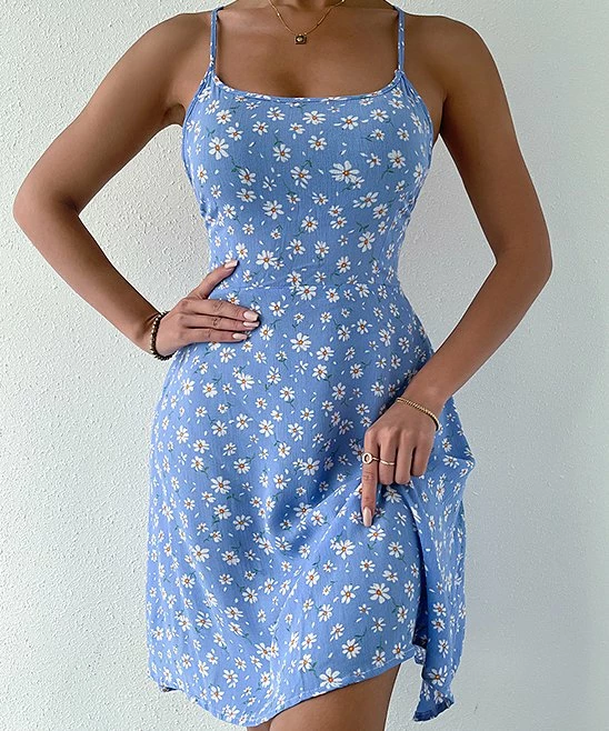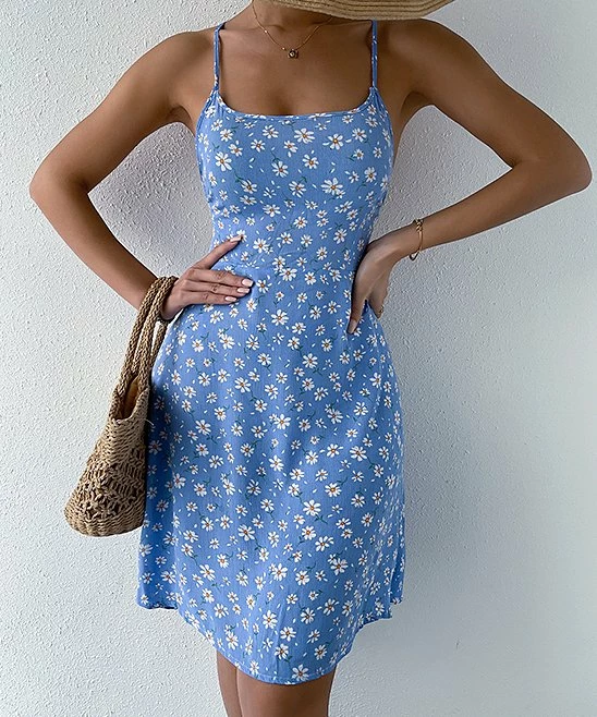 A form-fitting A-line front and self-tie crisscross strap back define this floral-printed dress.