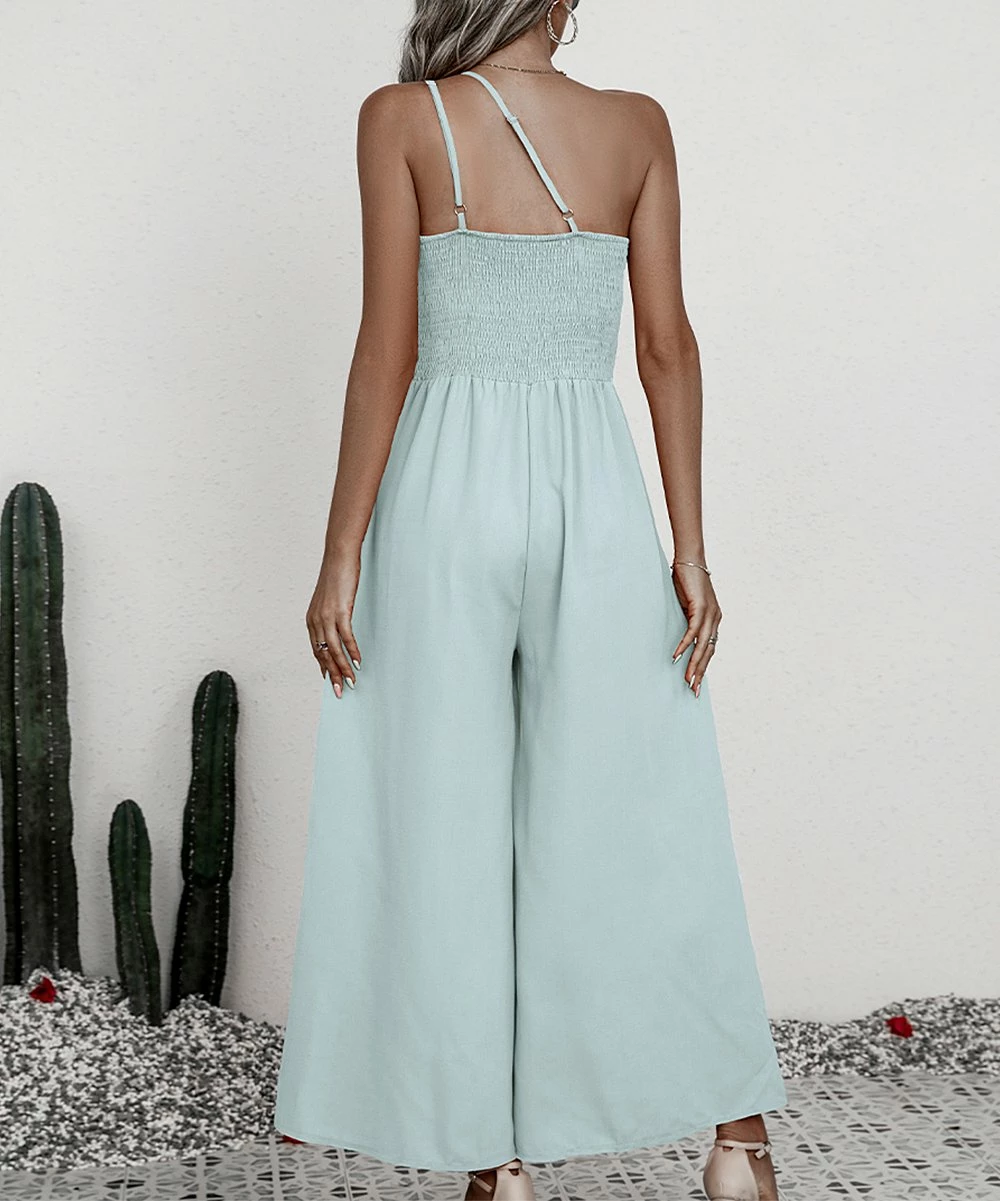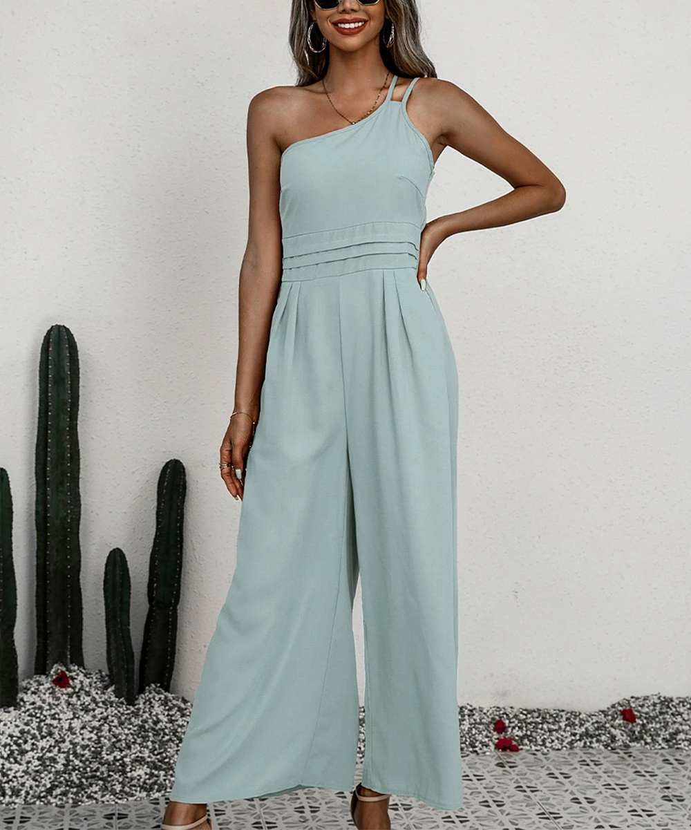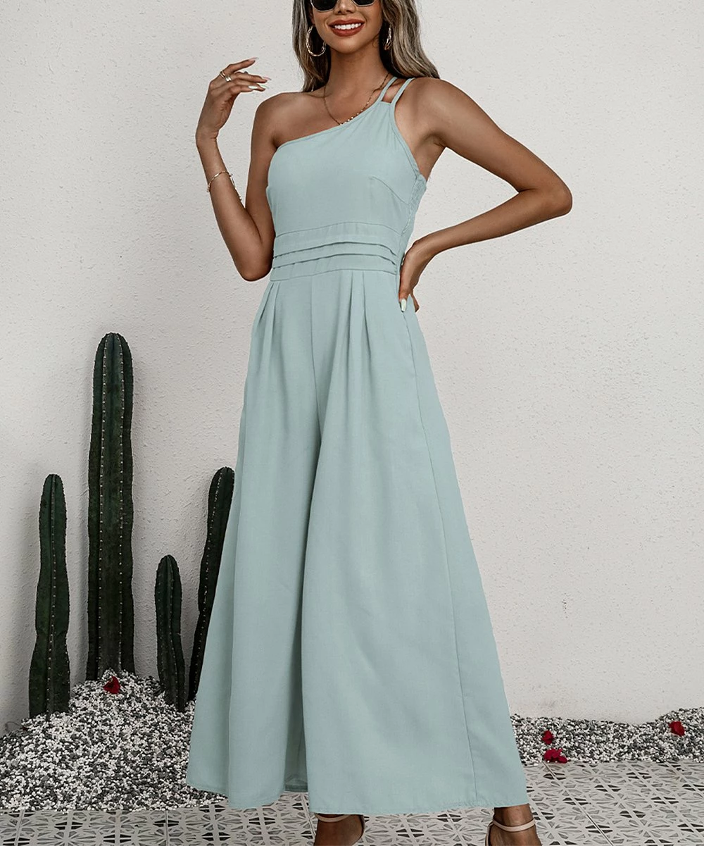 This chic jumpsuit features an off-shoulder design with wide, roomy legs and comes in an eye-pleasing hue.