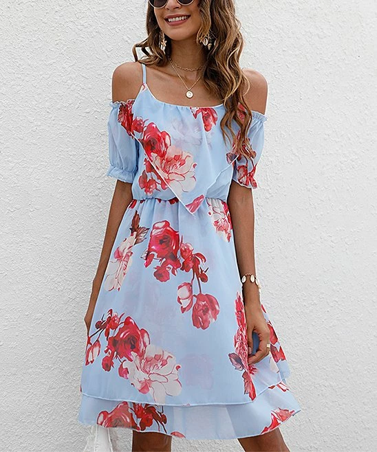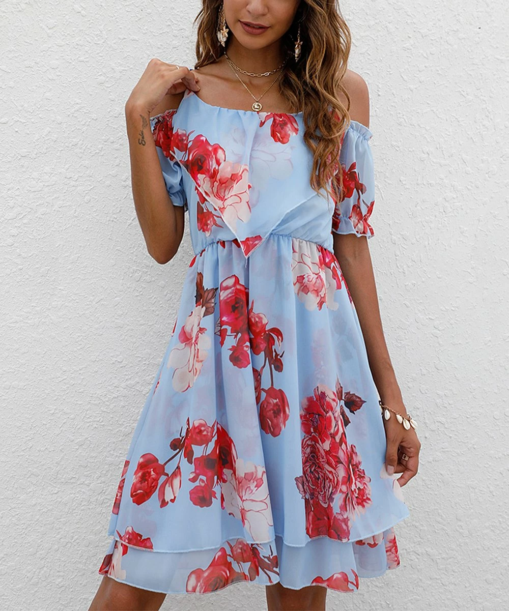 A playful print and flirty off-shoulder neckline accent this swingy chiffon dress for a bright, flowy fit.