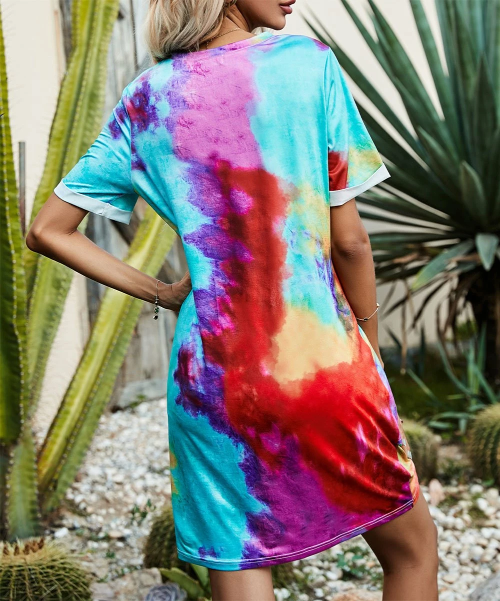 Add a vivid pop of color to your wardrobe with this tie-dye T-shirt dress boasting a v-neckline and twist-front design.