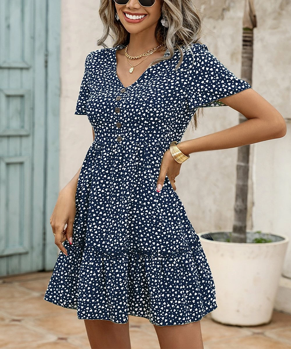 Fill out your sunny-day ensemble collection when you bring this charming dress that flaunts a flattering V-neckline finished with a charming heart pattern.