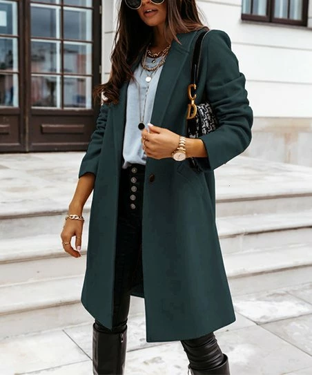 Wool coat featuring an elegant lengthened lapel and a bold single-color design.