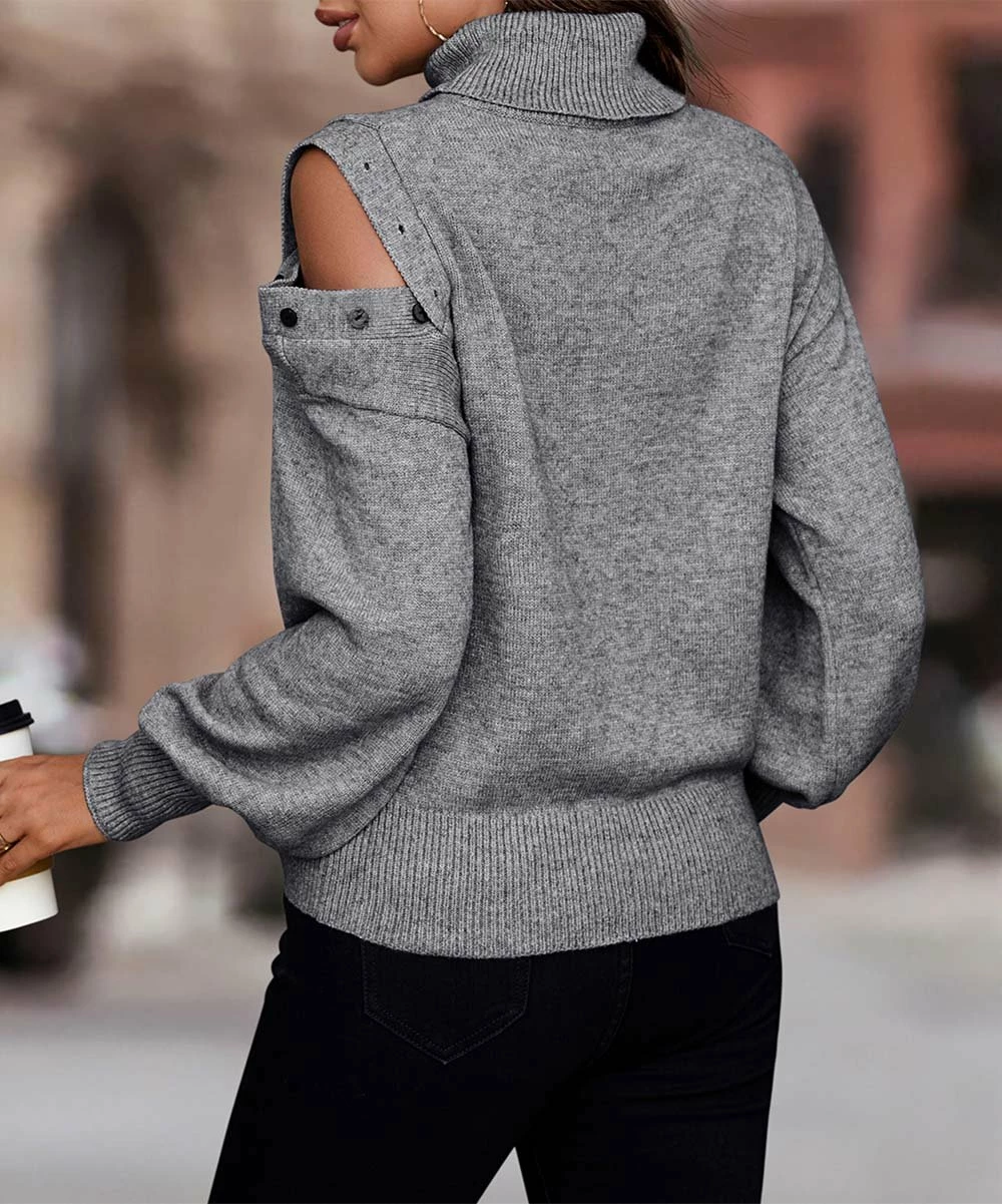 Turtleneck sweater featuring bishop sleeves and a shoulder-exposing button detail.