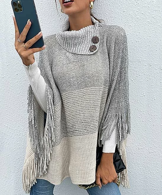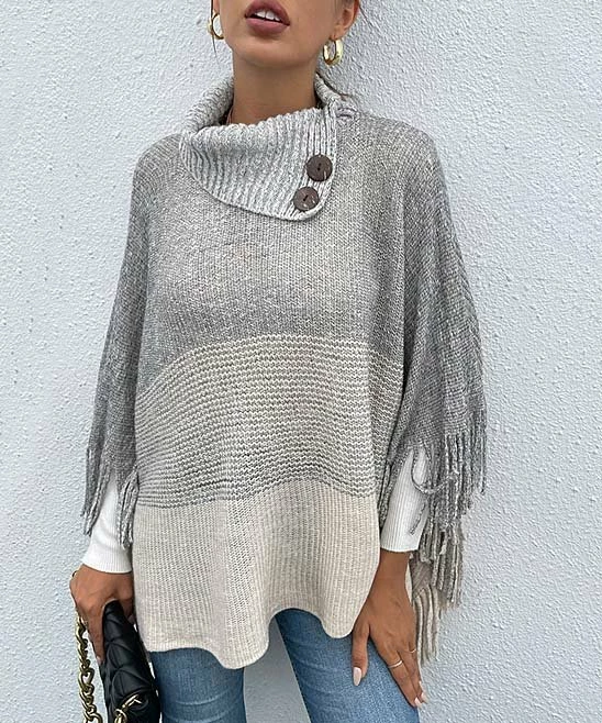 Top off your ensembles with this supersoft poncho featuring a buttoning turtleneck and trendy fringe trim for comfortable style that pairs effortlessly with jeans or leggings.