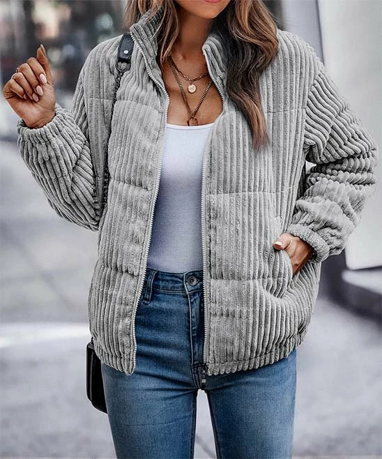 A corduroy fabric adds warmth and style to this puffer jacket with a zip-up front.
