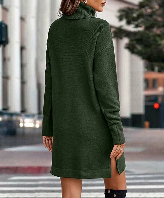 This sweater dress features side slits, a relaxed fit and warm turtle neckline.