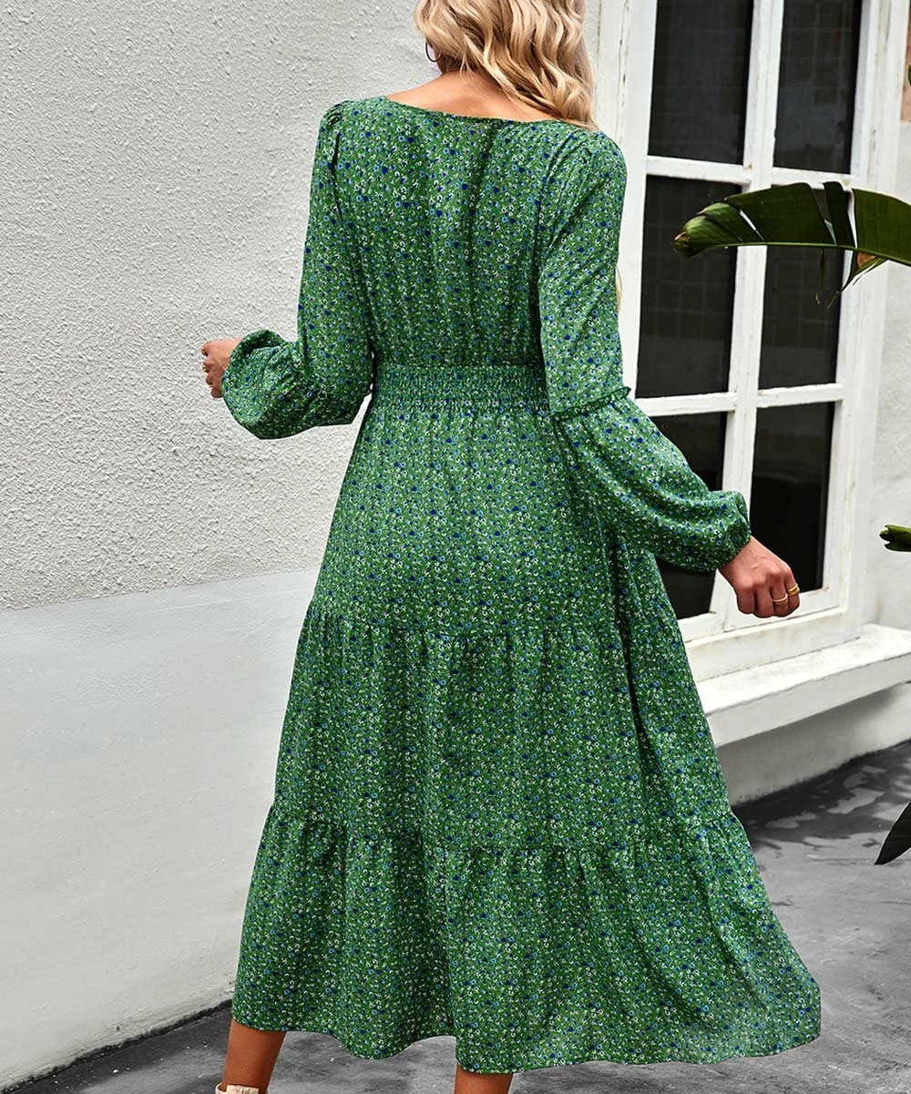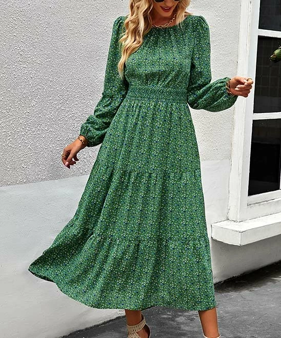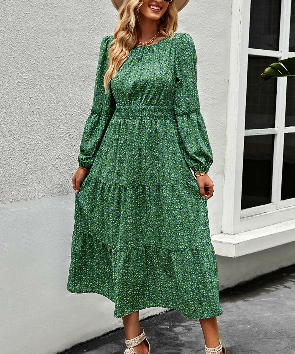 A maxi dress with a gathered neckline and tiered flounced skirt. Long bishop sleeves complete the look.