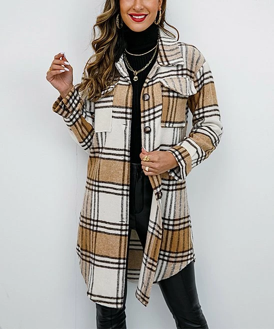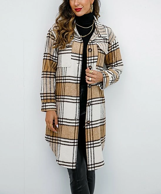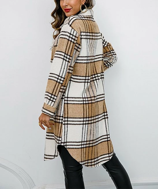 Refresh your outerwear rotation with the classic look of this longline shirt jacket featuring cotton-blend fabric and a neutral plaid pattern for comfortable street style.