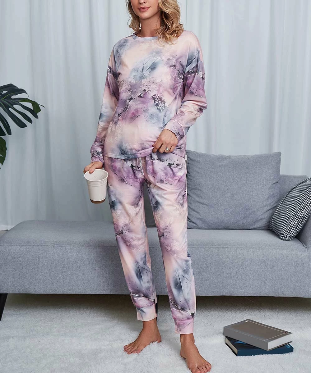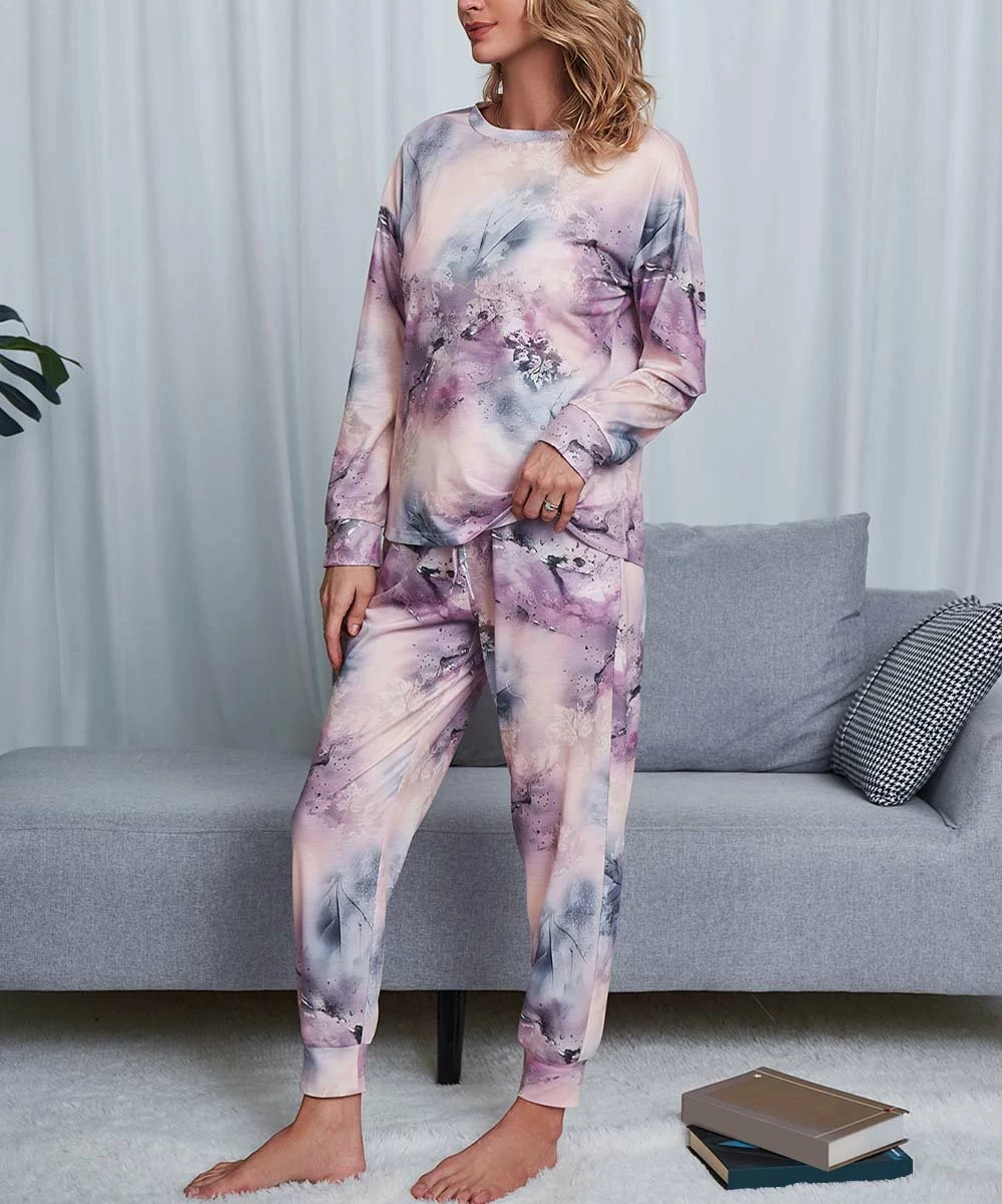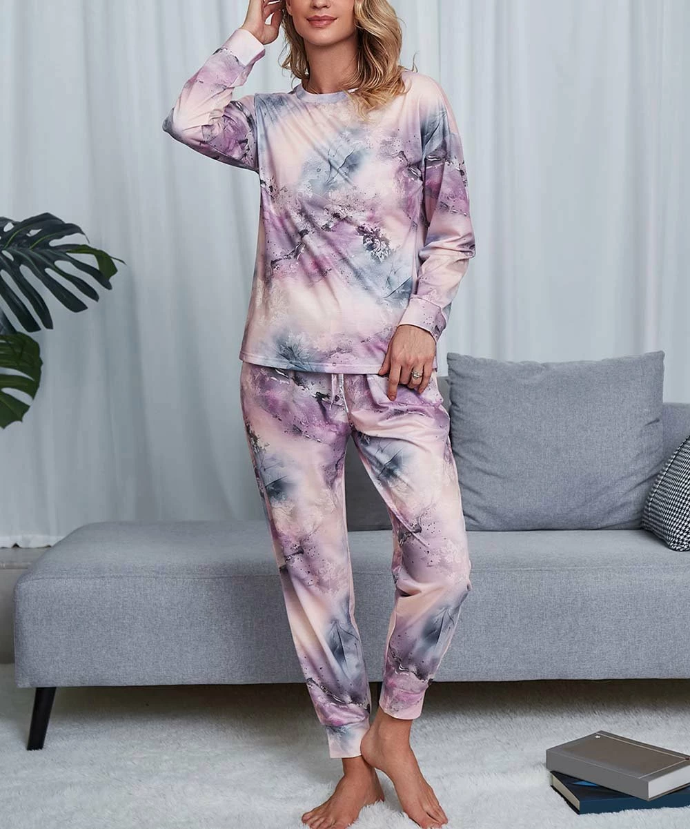 - Includes lavender and pink tie-dye long-sleeve top and matching drawstring joggers (two pieces total)