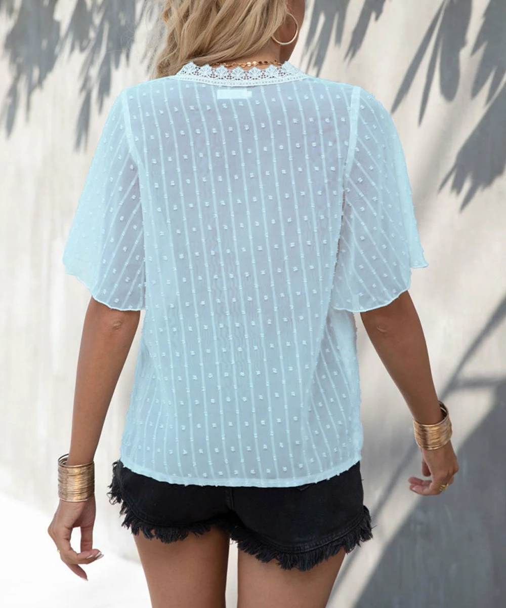 Bring a bright touch to your go-to top rotation with this elegant blouse that boasts a Swiss dot pattern finished with a flattering V-neckline.