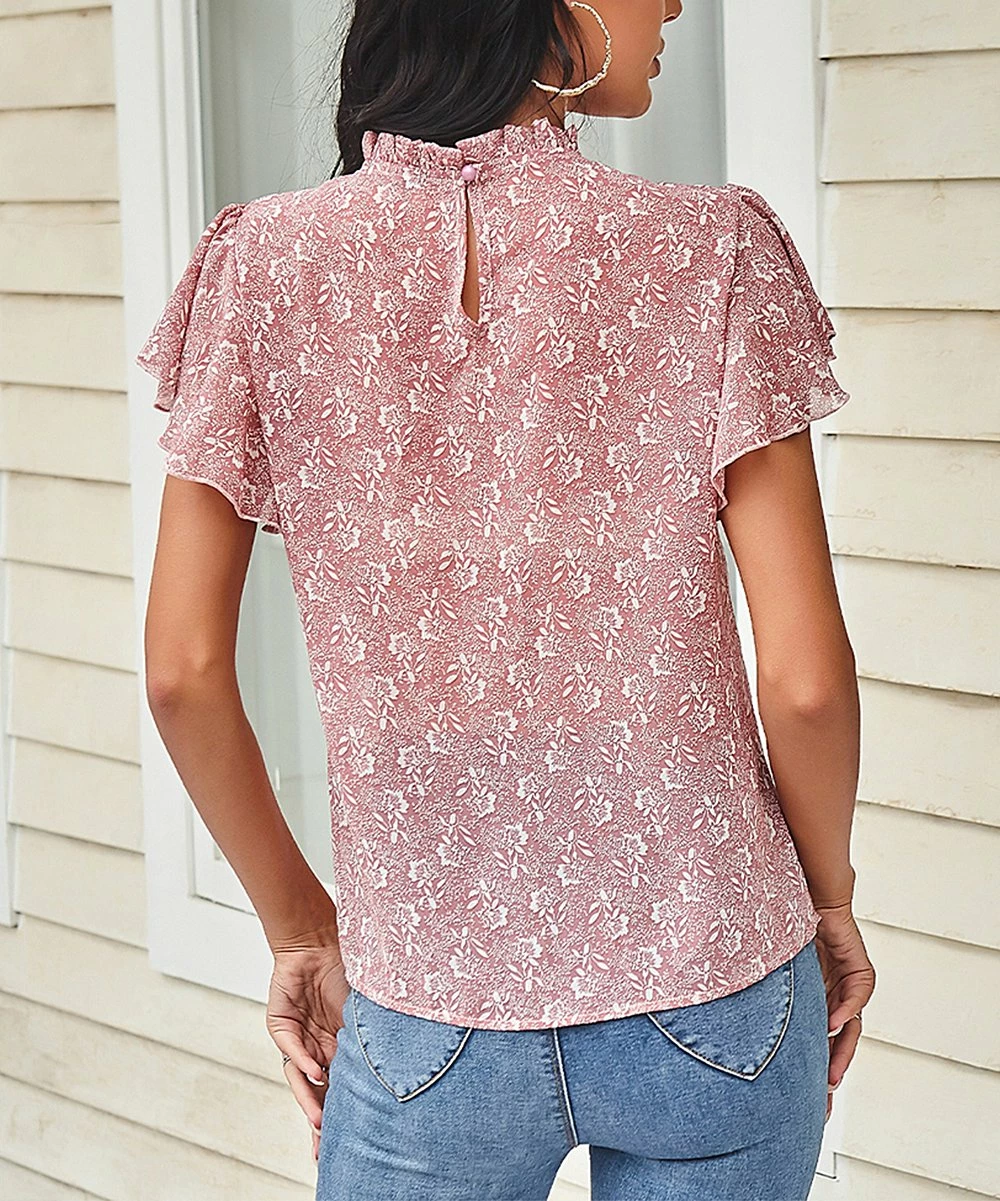 Show off your sense of style by opting for this romantic floral top that’s framed by fluttery sleeves. The pretty ruffled neckline buttons in the back, creating a keyhole effect.