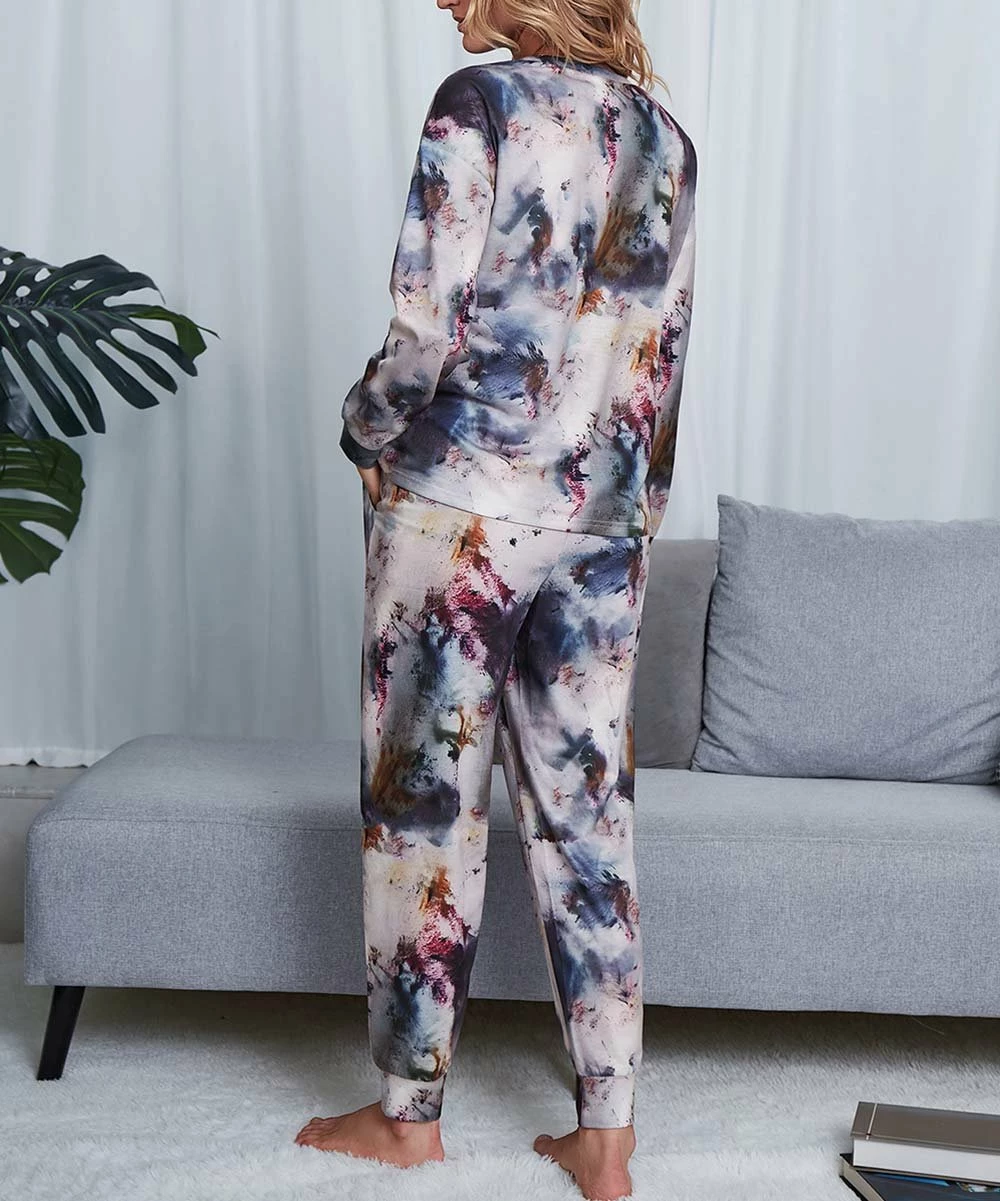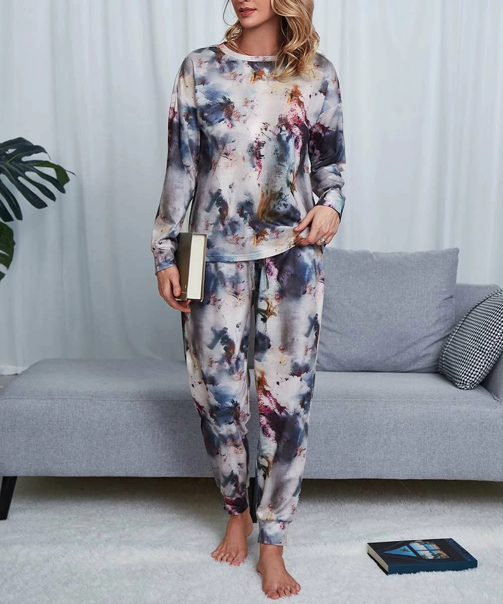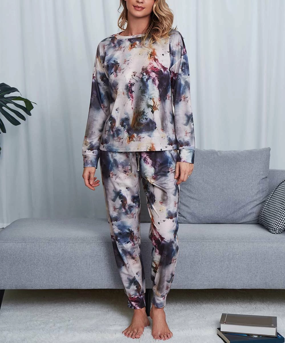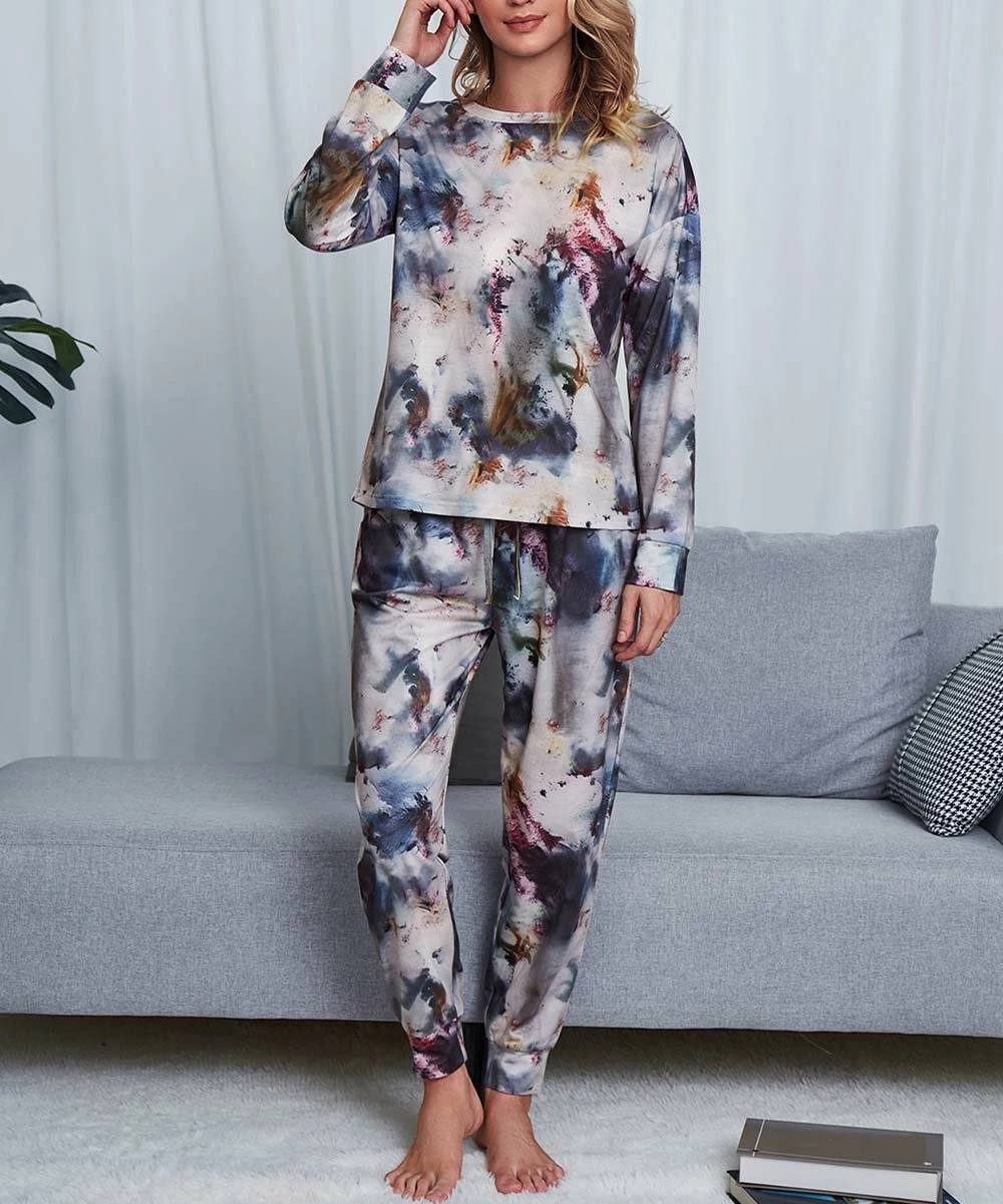 - Includes midnight blue and pink tie-dye long-sleeve top and matching drawstring joggers (two pieces total)