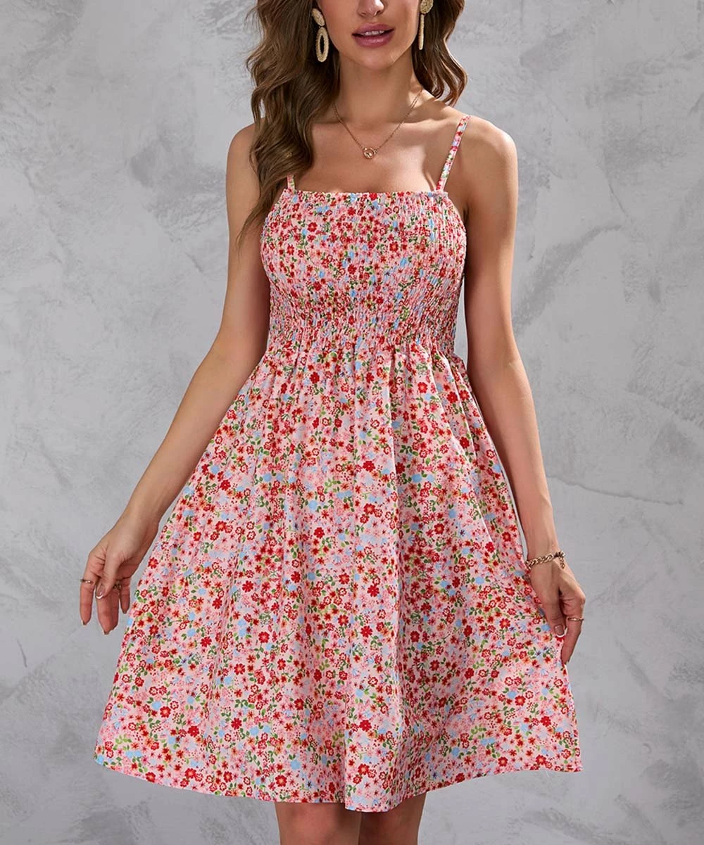 Thin shoulder straps and colorful floral print lend a playful touch to this stylish dress that can elevate your casual wardrobe.