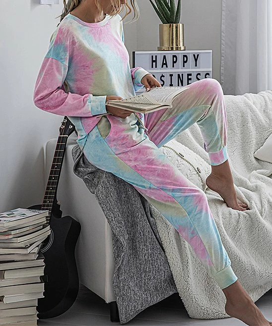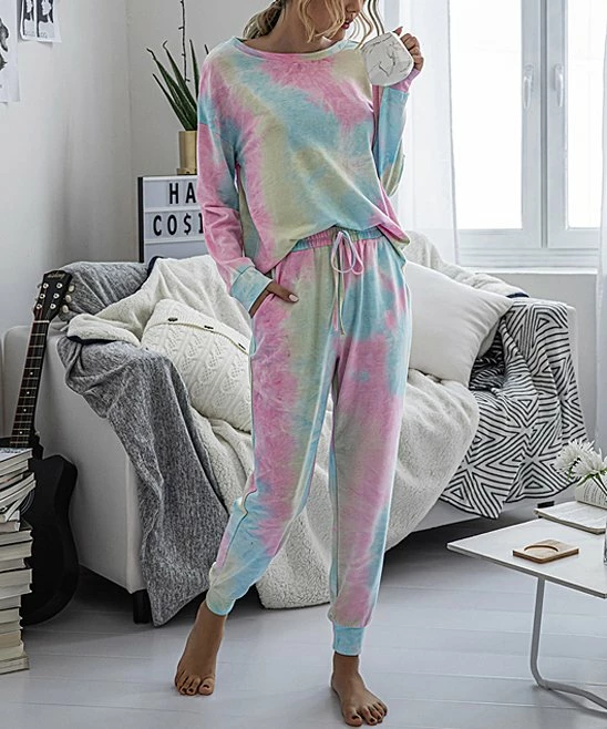 Embrace the cozy allure of this slouchy pajama set decked out in a tie-dye print for casual retro flair.