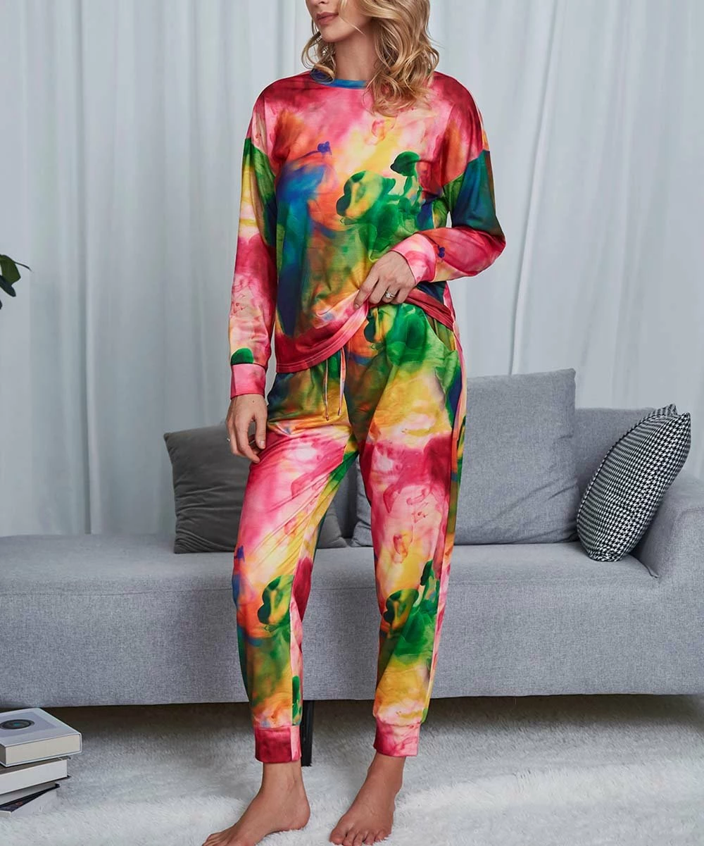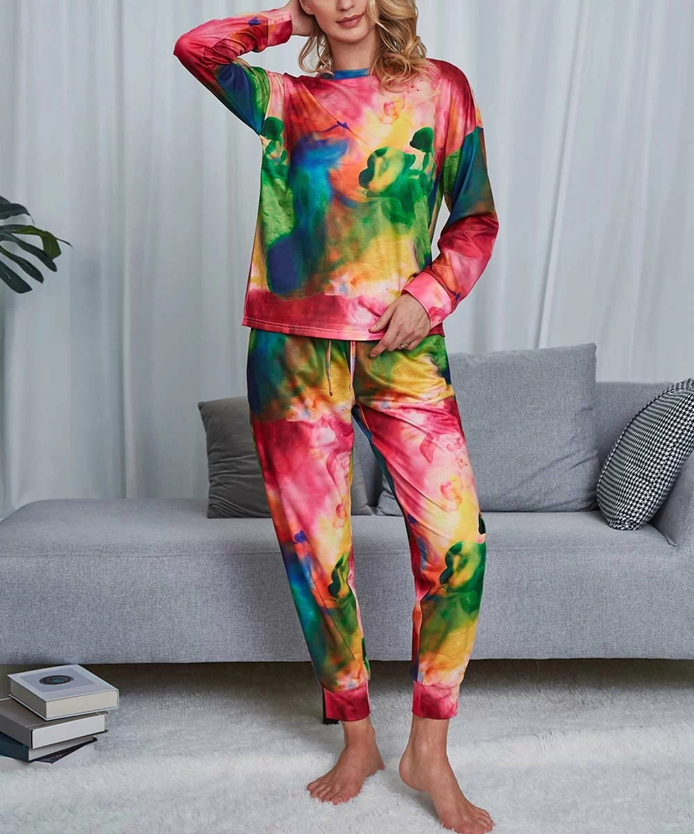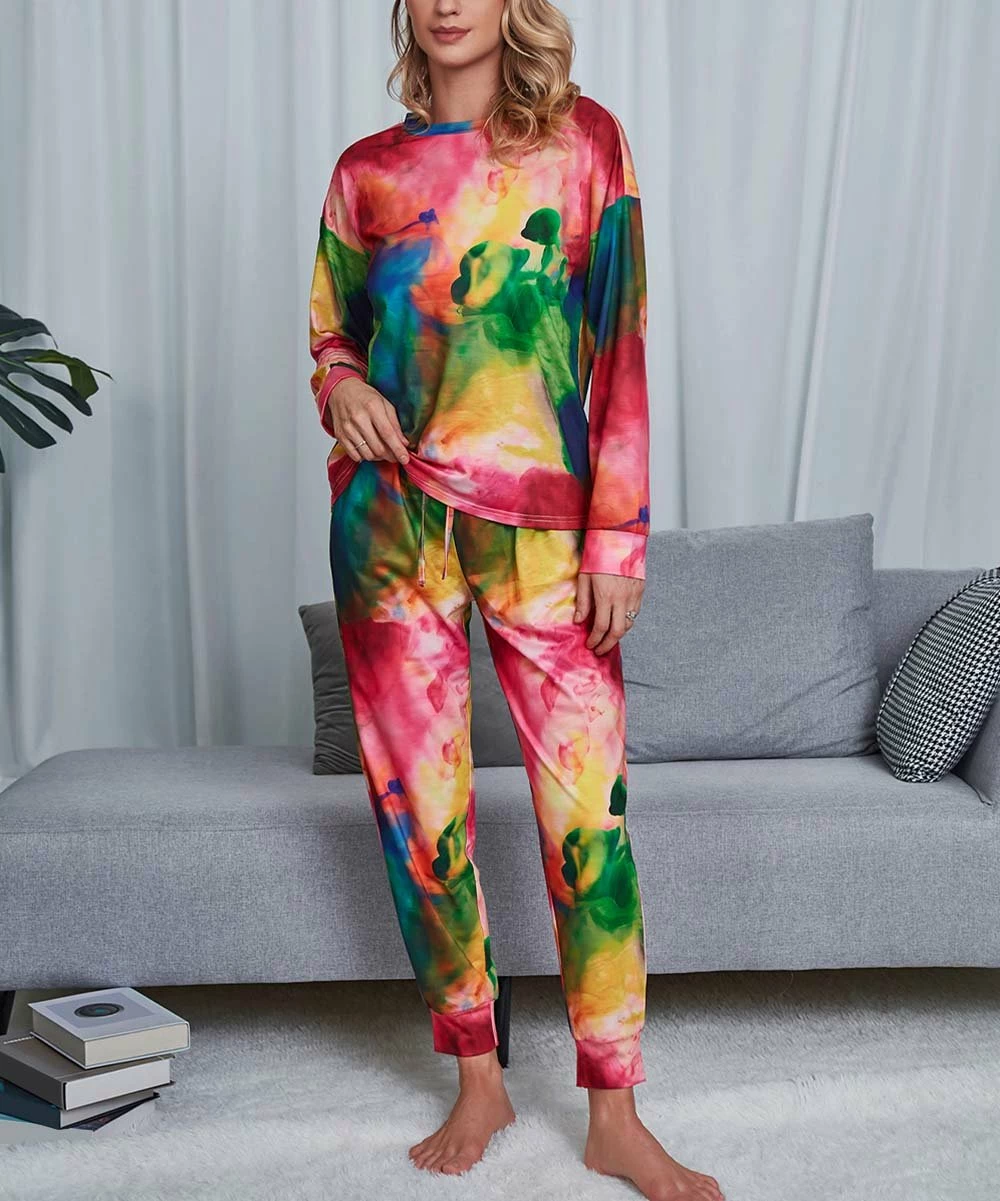 - Includes pink and green tie-dye long-sleeve top and matching drawstring joggers (two pieces total)