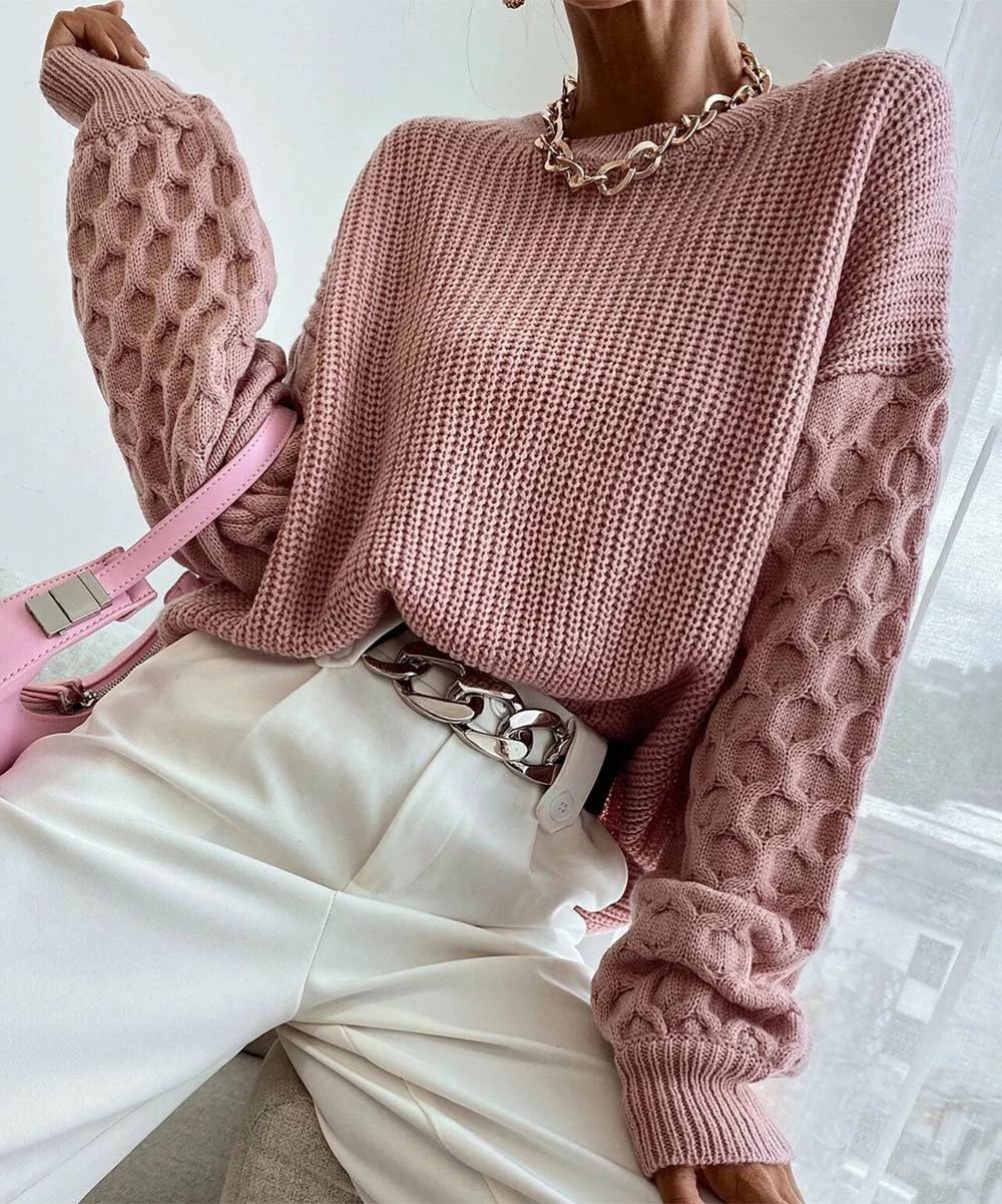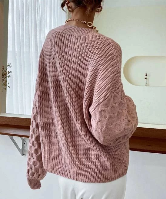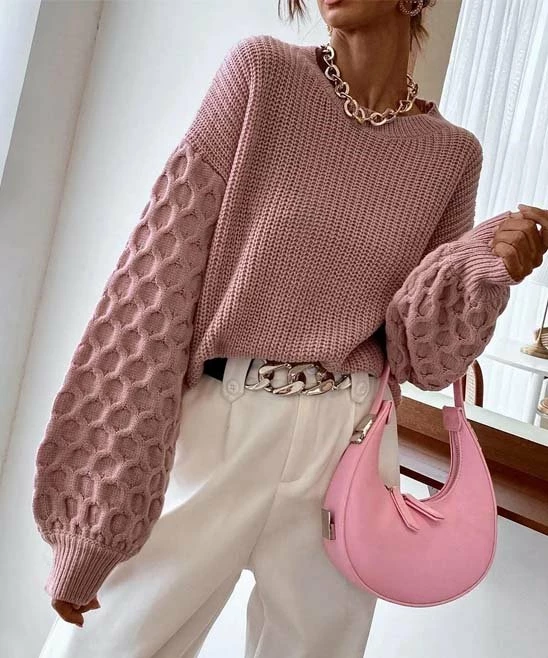 Textured bishop sleeves adorn this crewneck sweater in a versatile hue.