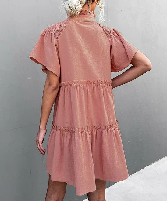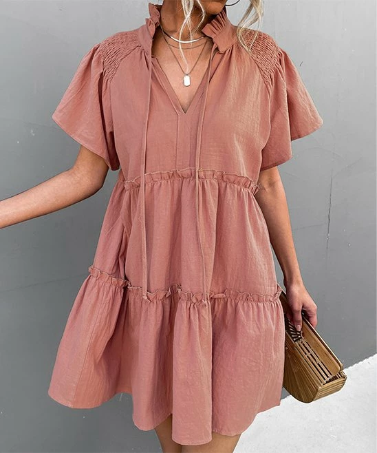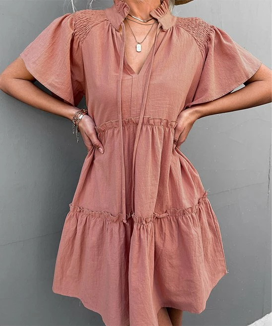 With a swingy tiered skirt, flutter sleeves and tied notch neckline, this versatile lightweight dress is one you’ll want in your closet.