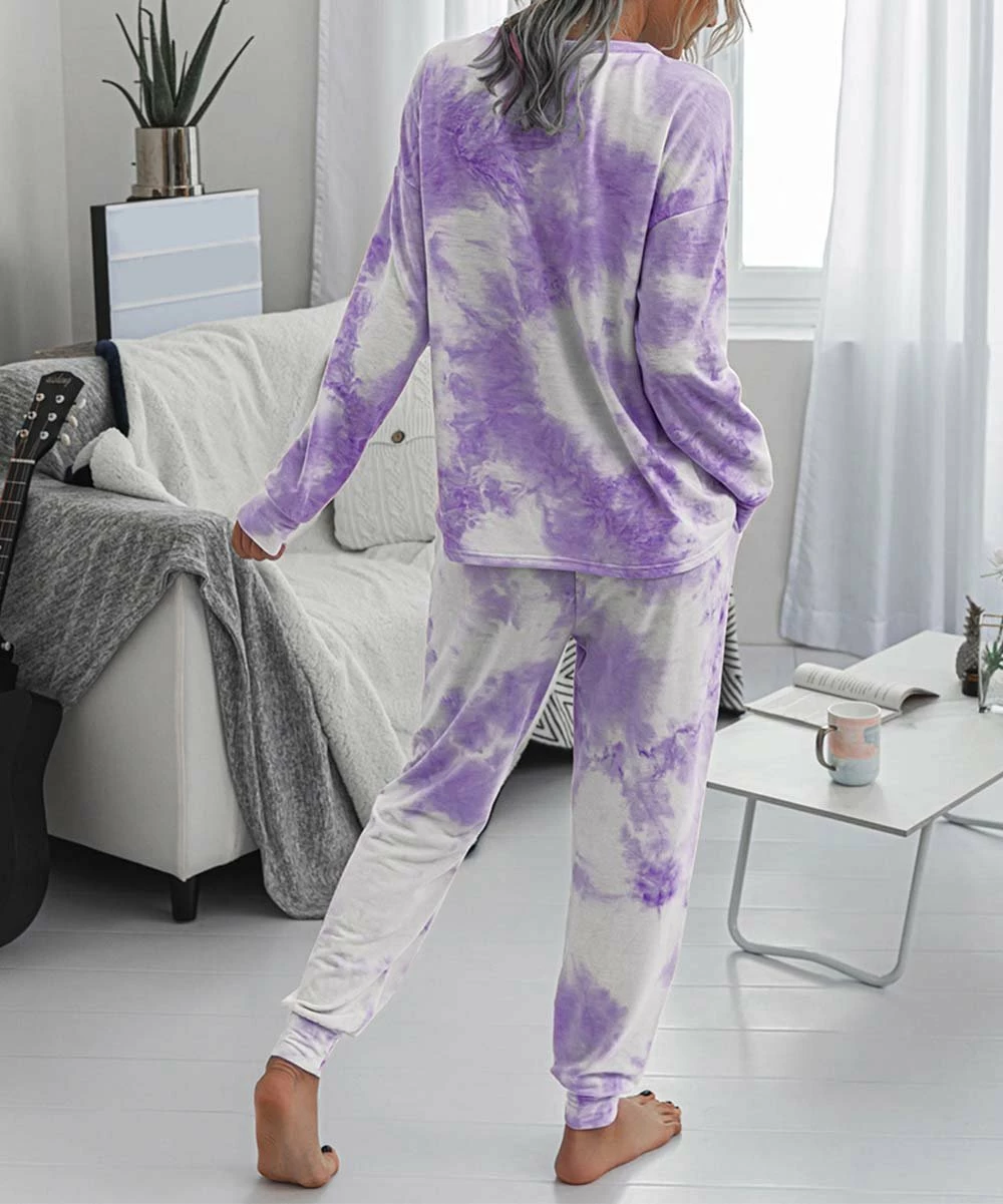 Go from running errands to relaxing on the couch in fashionable ease with the matching tie-dye design of this long-sleeve top and joggers.