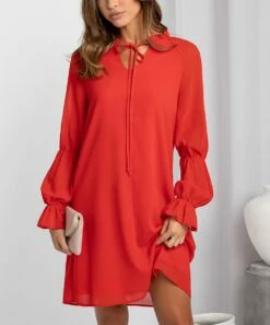 Vibrant-hued dress featuring a notch neckline with self ties and puffy poet sleeves.