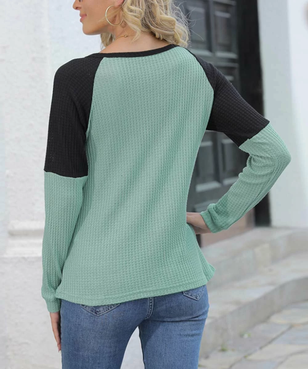 A long-sleeve raglan top crafted from stretch-enhanced waffle-knit fabric.