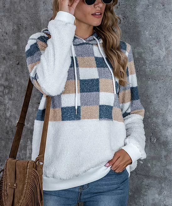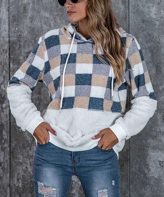 Style your everyday look with the modern pop of this contrasting hoodie made with a neutral-hued patchwork design.