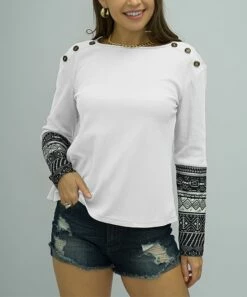 With geometric designs on the sleeves, button details on the shoulders, and a classic crewneck cut, this long-sleeve top is versatile enough to wear on its own but also looks great under a vest in cold weather.