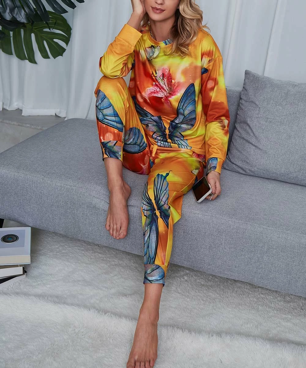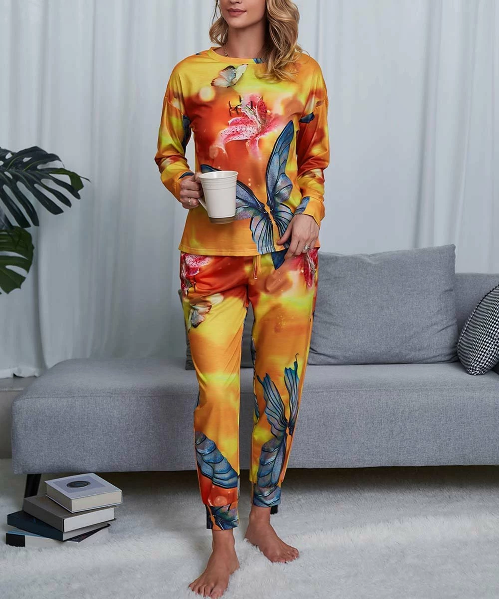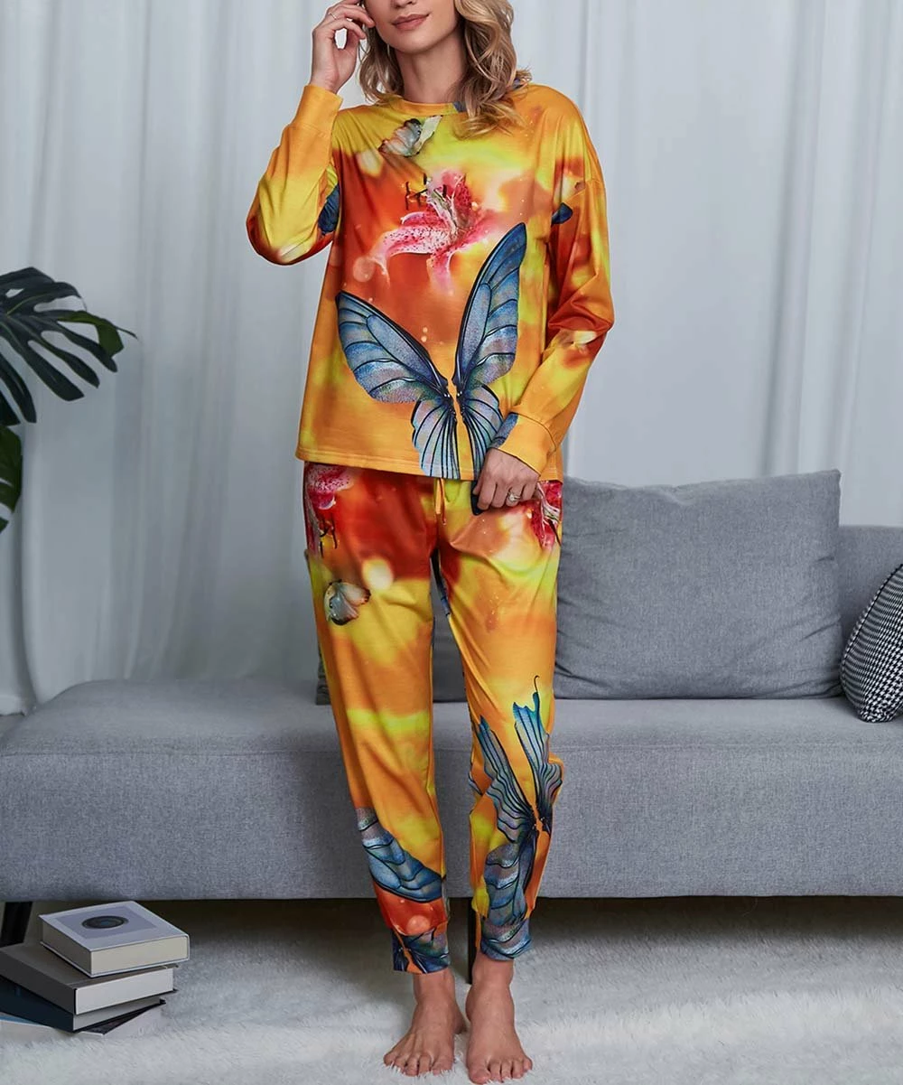 - Includes yellow and blue tie-dye butterfly long-sleeve top and matching drawstring joggers (two pieces total)