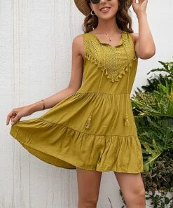 An embroidered front with playful tassel accents lend a touch of bohemian flair to this chic tiered dress featuring a charming notch neckline.