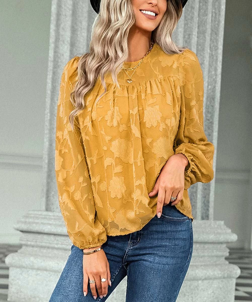 Poised button-up featuring lace accents and the added coverage of long sleeves.