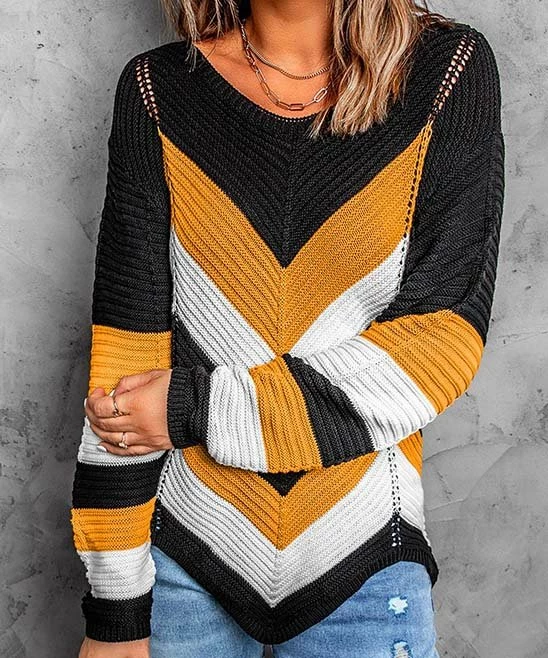 Cotton-blend sweater complete with v-neckline and color block stripes.