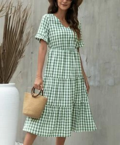 Best deal ๐ Romantichut Green & White Gingham Tiered V-Neck ๐ Dress – ๐ฉ Women ๐ฅฐ