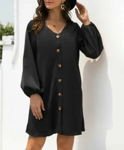 Best deal โค๏ธ Romantichut Black Bishop-Sleeve Button-Front Shift ๐ Dress – ๐ฉ Women ๐คฉ